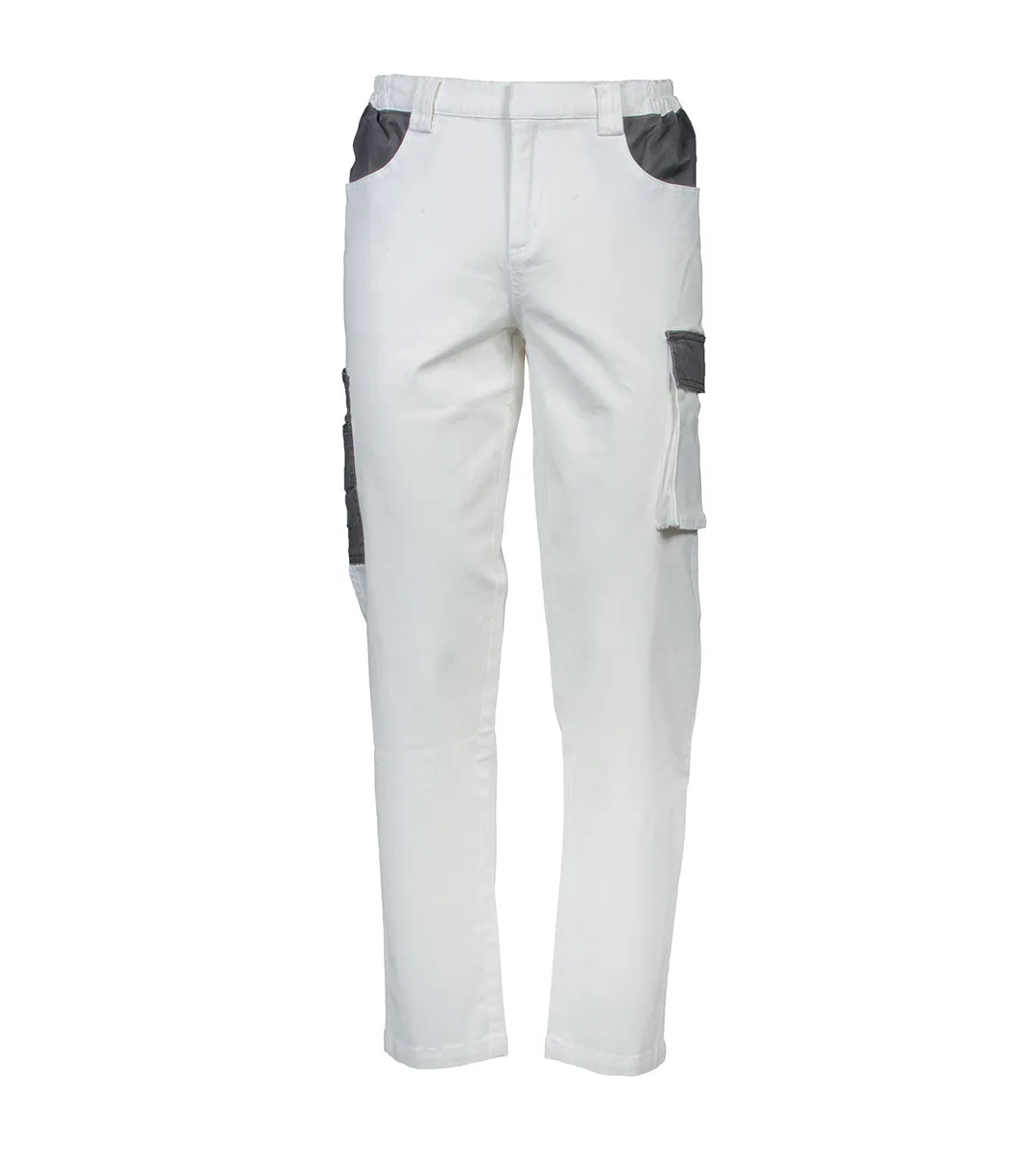 COMPOSIZIONE: Pantalone in cotone massaua 100%, 240 g / m², sanforizzato, patta con bottoni, 2 tasche anteriori, 1 tasca applicata posteriore, 2 grandi tasche ai lati, elastico in vita.
